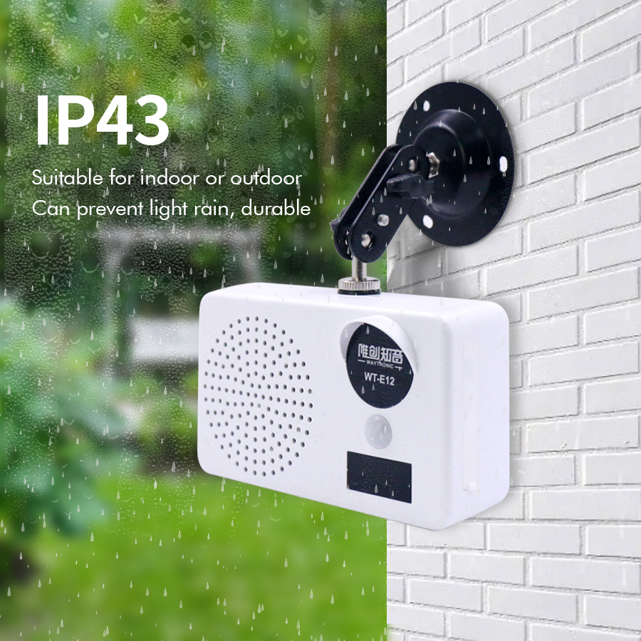 Boasts WayTronic high quality mp3 chips. Play sound when sensor is triggered. Indoor and outdoor versions are available. Support high quality MP3 music and changing sound freely. Suitable for advertising, security alert and audio guidance.