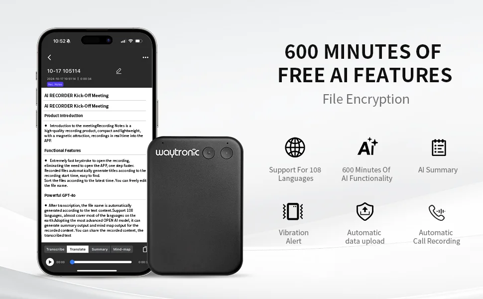 Portable Design and Long Battery Life:Ultra-thin 4mm magnetic design, metal body, directly attaches to phone. 350mAh battery, 30 hours of continuous recording. Includes all accessories, 600 free minutes/month.